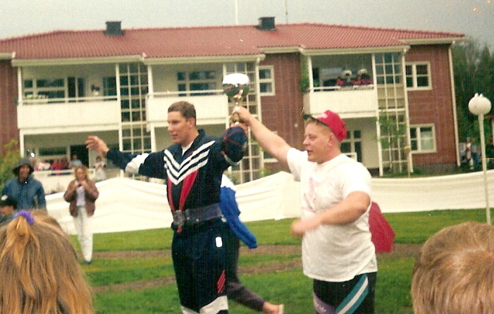 Ilkka Nummiston huoltajana. Vuoden 1990 Maailman vahvin mies -kilpailussa