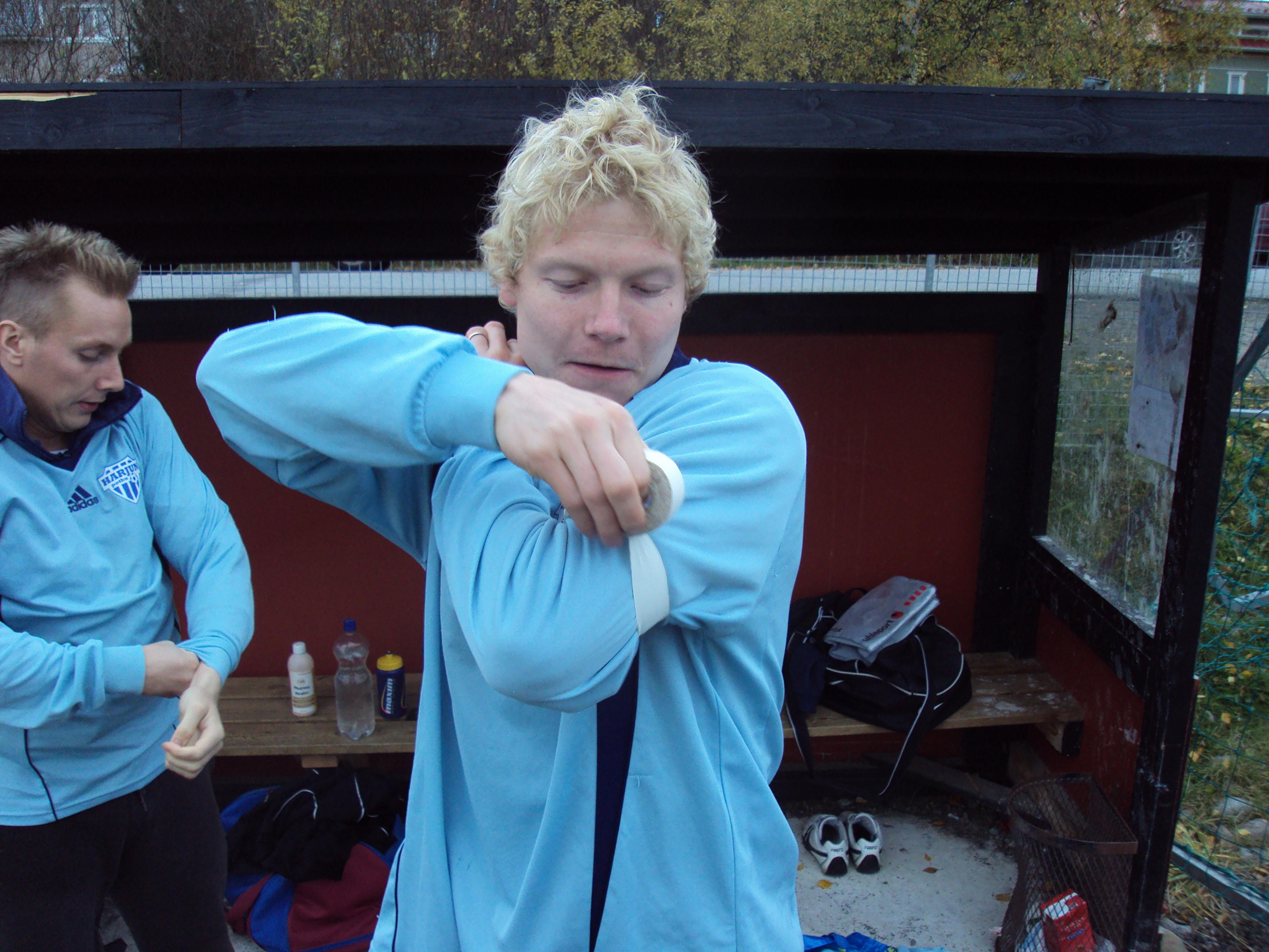 Ilmari Liimatainen laittamassa kapteeninnauhaa ennen pelin alkua.