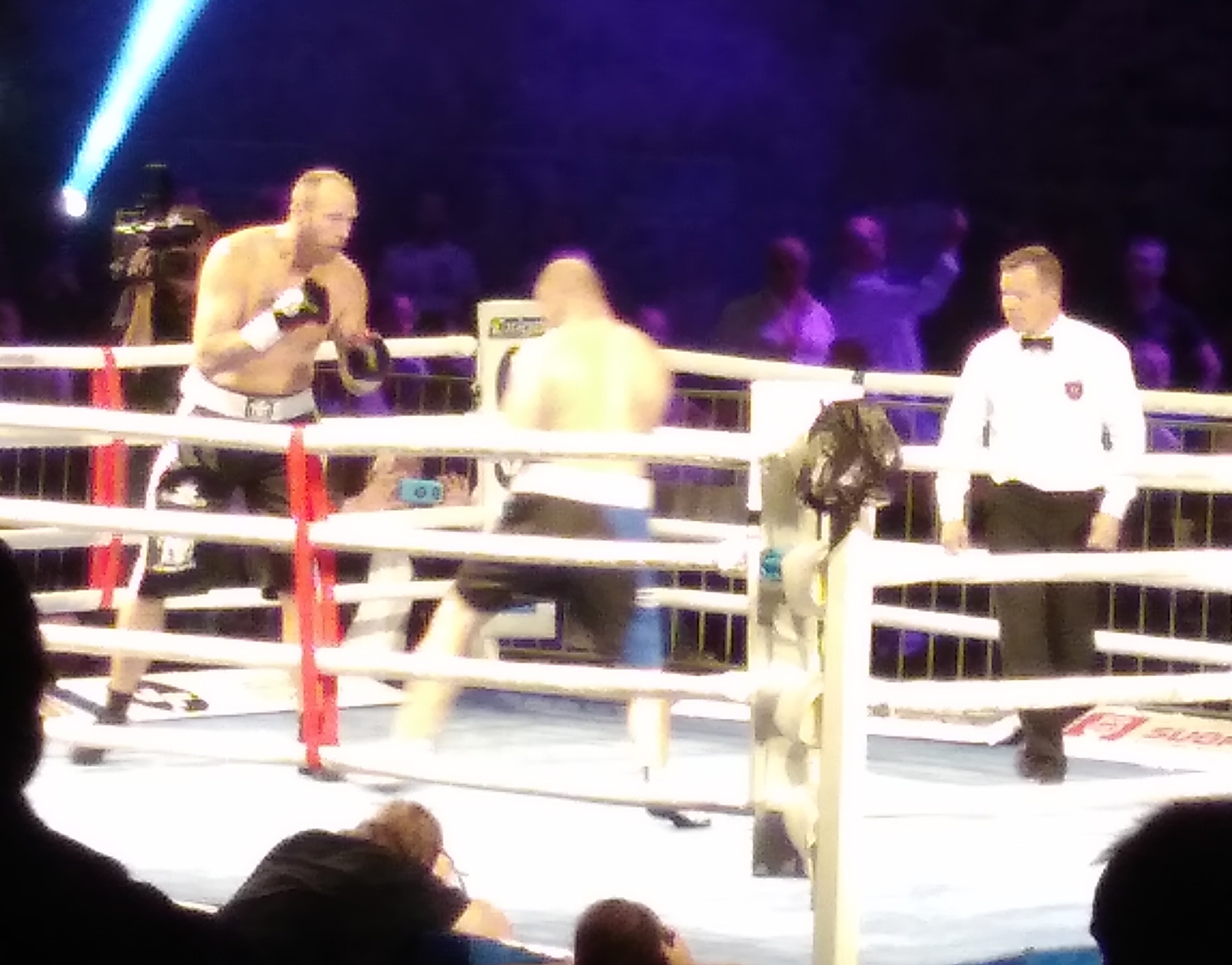 Robert Helenius aloittaa ottelun ranskalaista Johann Duhaupasia vastaan loistavasti. Helenius lyö heti alkuun kovaa vartaloon. Etukäsi toimii hyvin ja ranskalaisen yritykset Helenius joko torjuu käsillään tai liikkumalla alta pois. Toisessa erässä Helenius osuu jälleen hyvin vartaloon ja iskusarjatkin lähtevät terävästi. Duhaupas jatkaa kuitenkin jatkuvaa eteenpäin menemistä, mitä oli ensimmäisessä erässäkin tehnyt. Kolmas erä ja jälleen Helenius iskee kovaa vartaloon. Duhaupas osuu vasemmalla, mutta Heleniuksen hetkellinen aggressiivisuus pakottaa Duhaupasin liikkumaan taaksepäin. Duhaupas osuu ja Heleniuksen nenästä alkaa vuotaa verta. Helenius päättää kolmannen kuitenkin erän hyvin.