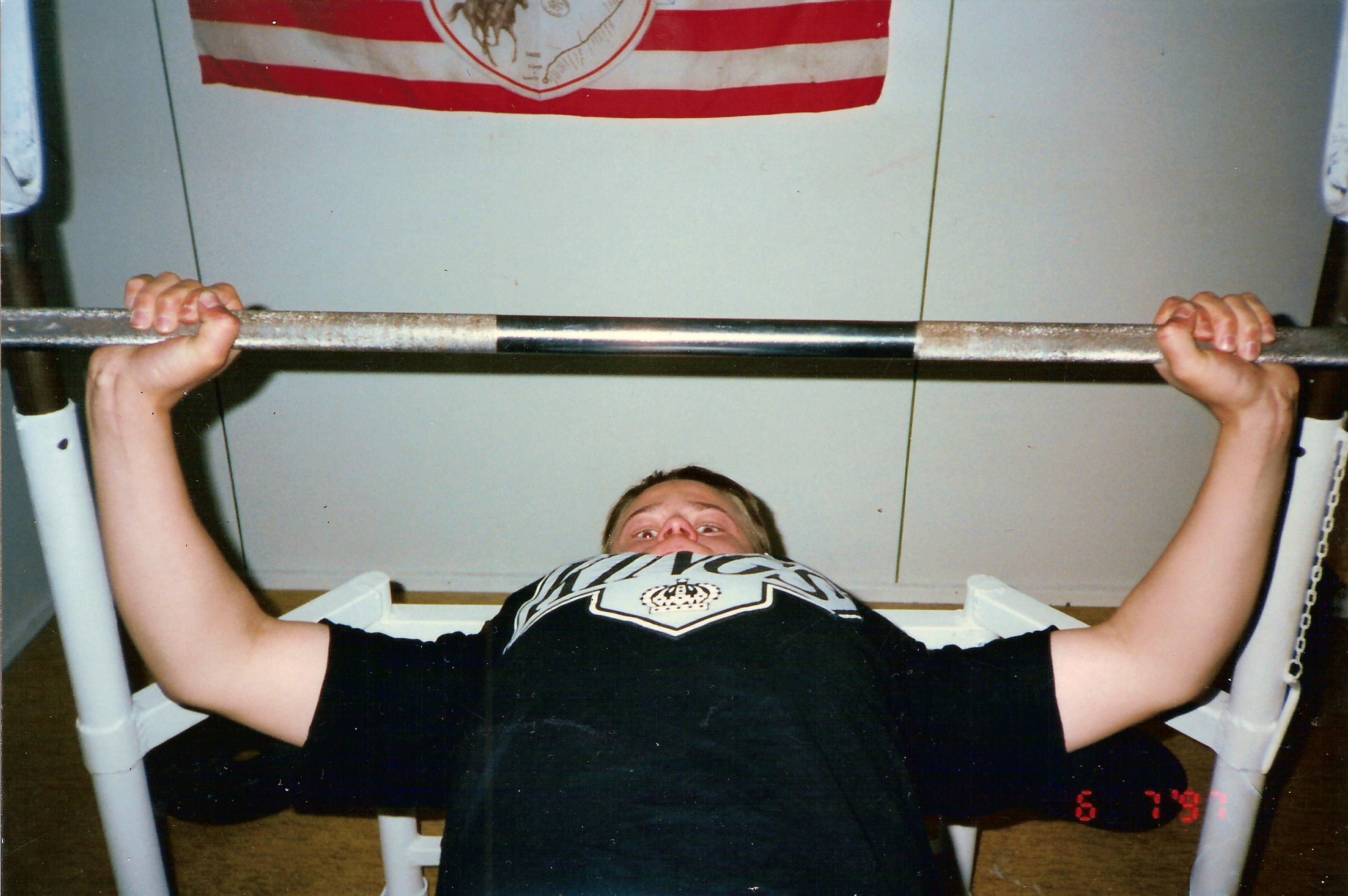 Loppukevennykseksi arkistojen kätköistä löytyi vanha kuva penkkipunnerrustaipaleeni alkupuolelta. Muistan, että kuvasta katsoen oikealla puolella sijaitsi sänkyni ja heti sängyn vieressä siis penkkipunnerruspenkki. Levypainoja lojui aina pitkin huoneeni lattioita ja niihin tuli muutaman kerran potkittua jalkansa.